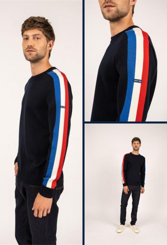 Ref.: SJPULLRAGLANELYS-2315PULL RAGLAN ELYS Pull homme SAINT JAMES. Pull col rond 100% laine Collaboration Élysée Bande tricolore bleu/blanc/rouge le long des manches. Tricoté dans nos Ateliers. Prix : 185 €.