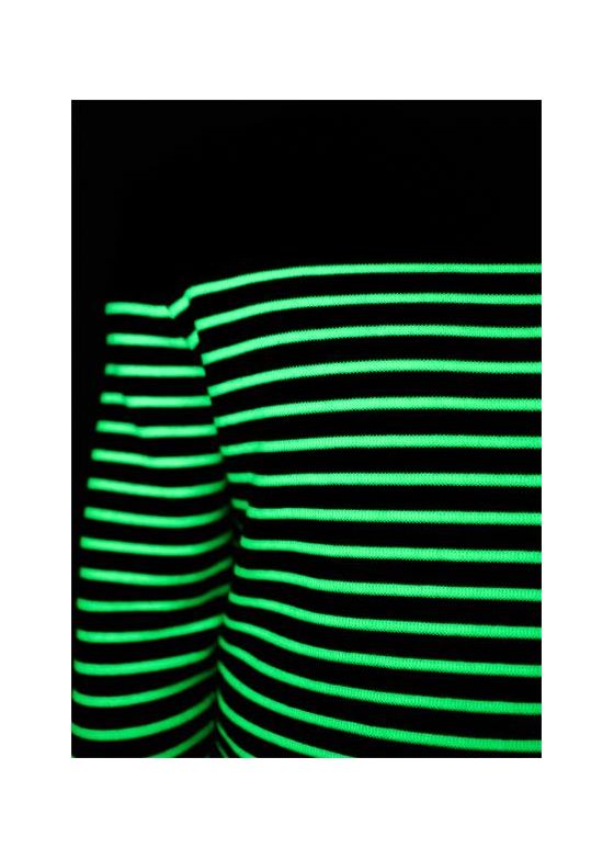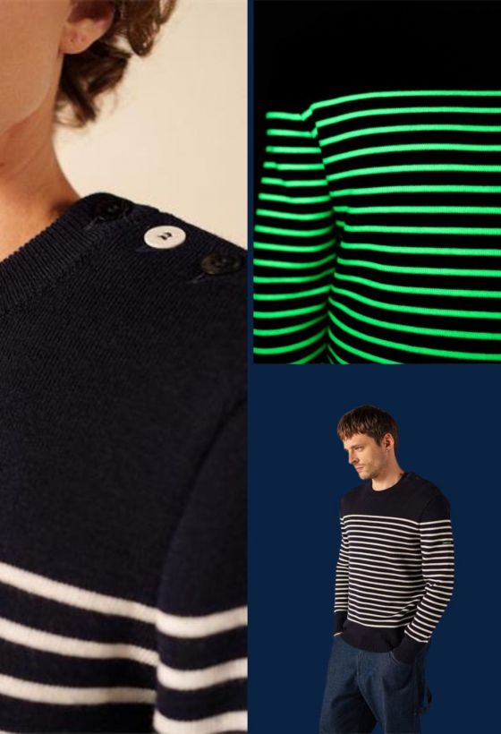 Résumé : Pull marin mixte en côte 1x1, laine 80% / polyester 20%, col rond, coupe droite. Ses rayures et un bouton deviennent phosphorescents dans l’obscurité après exposition à la lumière. Couleur : Marine/Phosphorescent. Prix : 199 €.