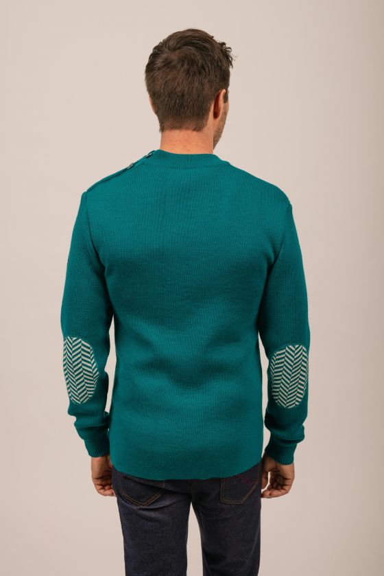 Les coudières sont bicolores tricotées en chevrons que l'on retrouve sur deux boutons gravés.