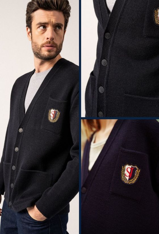 Résumé : Réédition d’un modèle iconique de 1984 : cardigan col V en 100% laine, blason brodé poitrine, boutons gravés, poches plaquées. Esprit preppy, unisexe.